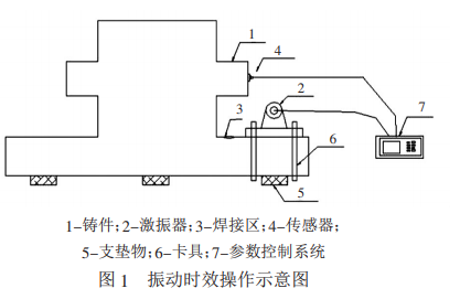 振动时效工艺是将激振器固定在铸件的适当 位置,通过振动设备的控制系统,根据铸件的吨位 大小和形状调节参数, 使连接在铸件上的传感器 ( 加速度计) 接收的信号达到最大值,此时表明铸件 已达到共振。 在该状态下持续振动一段时间,即可 达到消除应力的目的。
