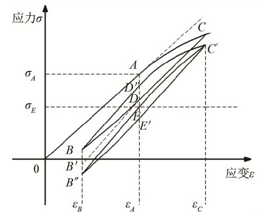 图 1 为金属材料受等幅交变应变 eB -eC 作用时 的应力应变曲线,图中 OA 为弹性载荷段,构件的 初始残余应力为 s A ,ACB 是第一次发生屈服变形 后的应力应变曲线。构件内的总应力超过屈服点而 发生变形,在 C 处残余应力沿弹性卸载荷线 CB' 下 降,经过 D 点后曲线偏离 CB' 至 B 点,完成一次交变应变循环。经过多次交变循环后,曲线循环稳定 为 C'E'BEC' ,此时残余应力由s A 减小至s E ,残余 应力减小至稳定的过程就是振动时效宏观机理的直观表示。