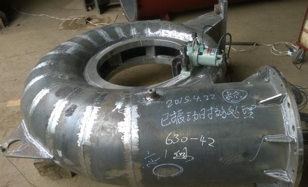 华云振动时效设备在蜗壳消除应力中的应用,上图装夹的设备为振动时效激振器。